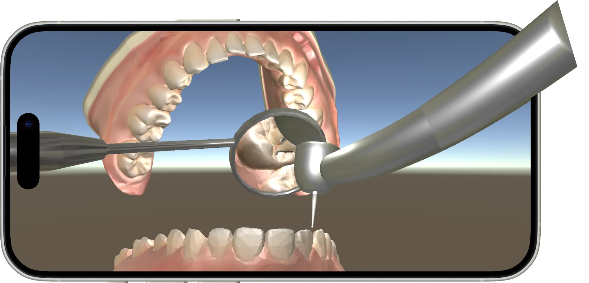 Dental MirrorMaster takes this a step further by 3D modeling the patient’s position and instrument alignment. As shown in the images below, the app mirrors real-life scenarios, making it far more effective than traditional methods, such as drawing reflected images from a hand mirror.