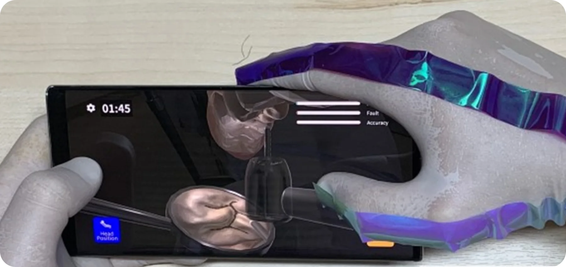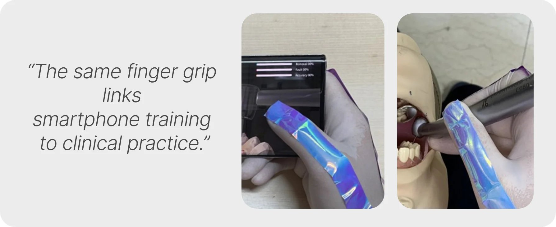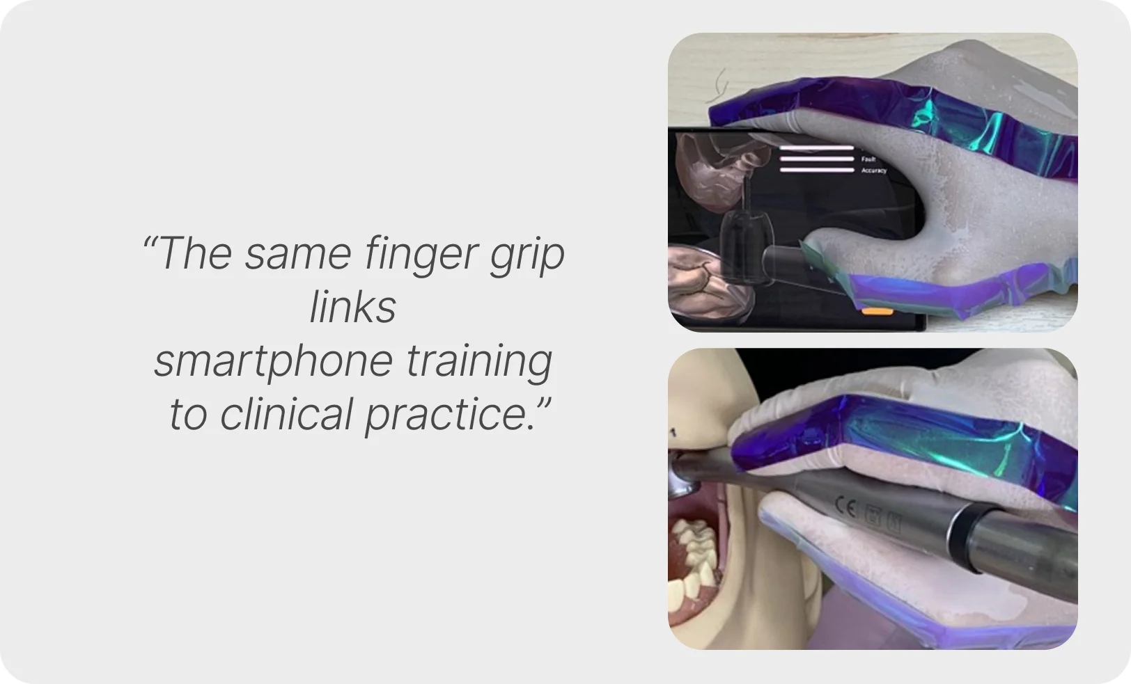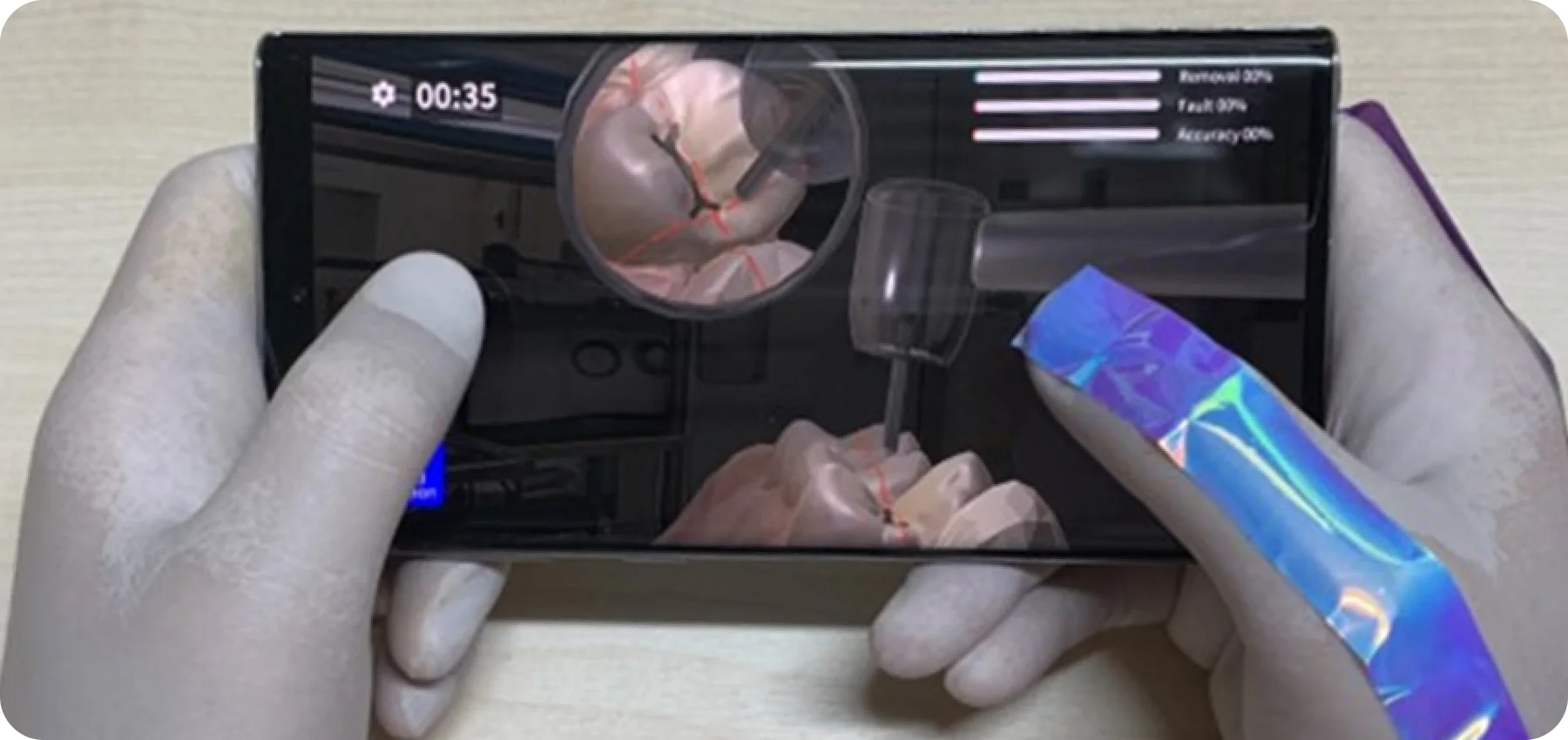 One of the app’s key strengths is its closely mimicking real-life instrument handling. The position of your thumb when controlling the handpiece in the App during training is nearly identical to how you would hold and maneuver a handpiece in practice.