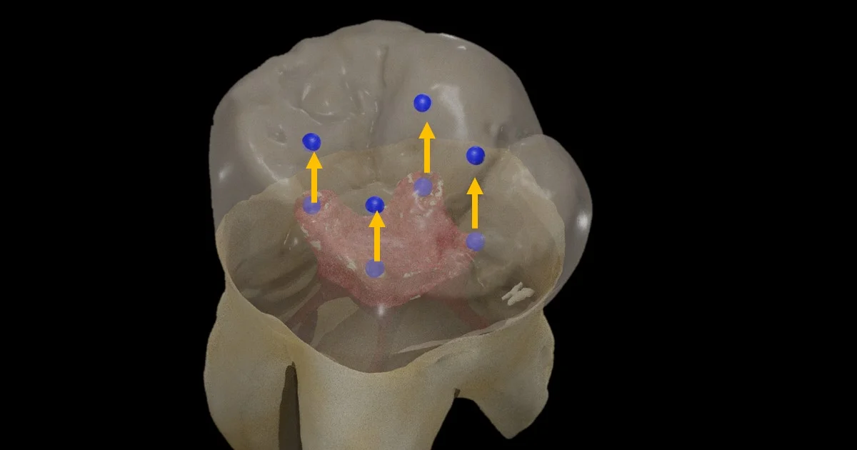 For example, while micro-CT images are commonly used to visualize internal structures, they rarely show where these internal landmarks align with the occlusal surface. Existing research indicates that the pulp chamber roof is near the CEJ line, but the precise locations of canal entries on the occlusal surface are unknown.