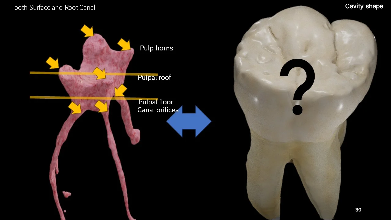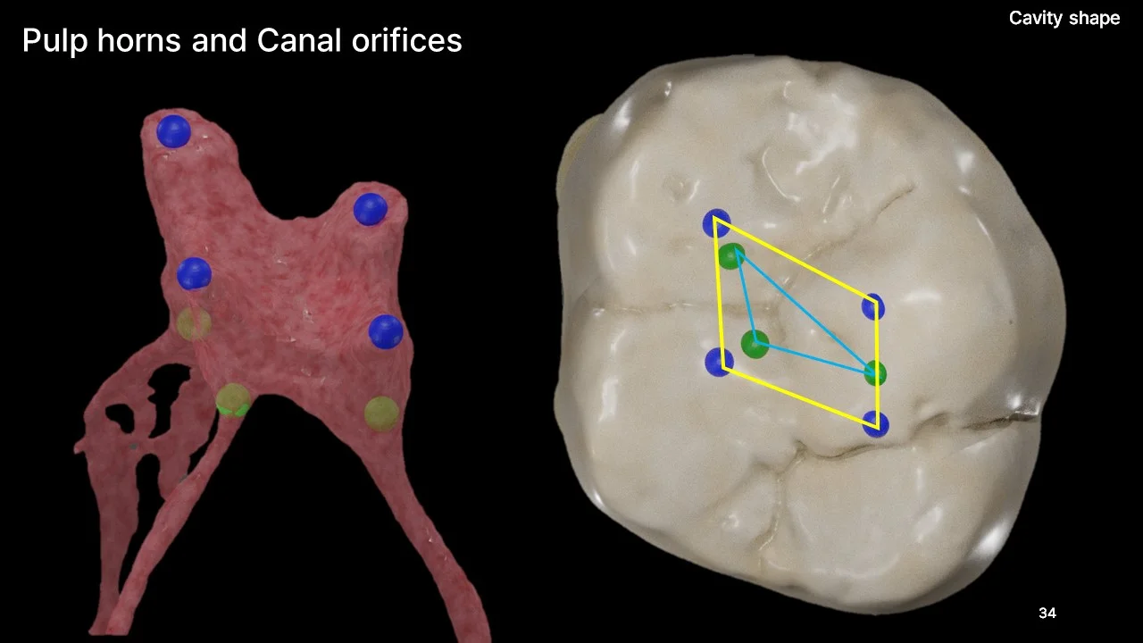 Generalizing the less variable shapes of pulp chambers provides several clinical advantages. The first is standardizing the shape of access cavities. We can pre-design the access cavity shape by predicting the positions of critical points like the pulp horns and canal entries. This offers several benefits: