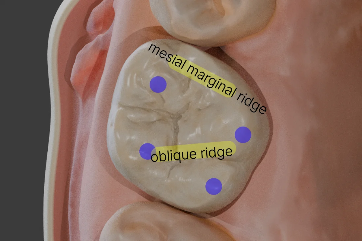 The maxillary first molar has four cusps: two buccal cusps and two palatal cusps. When creating an access cavity, care must be taken not to invade the mesial marginal ridge or the oblique ridge.
