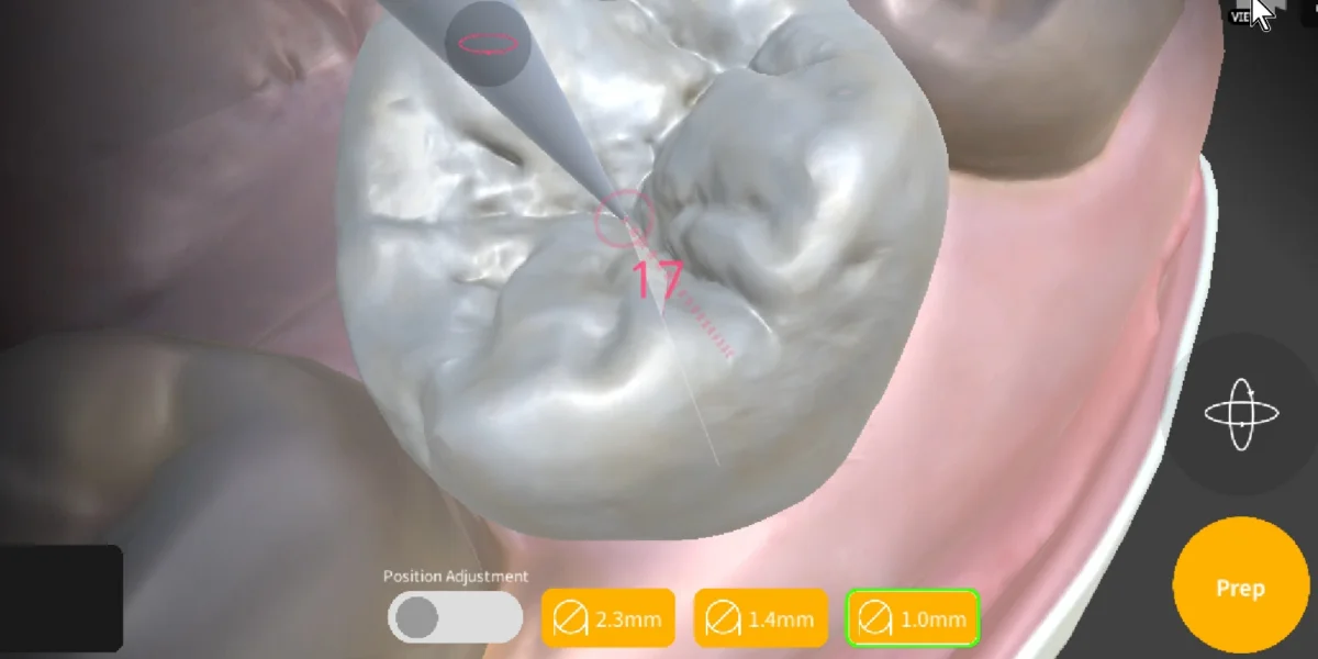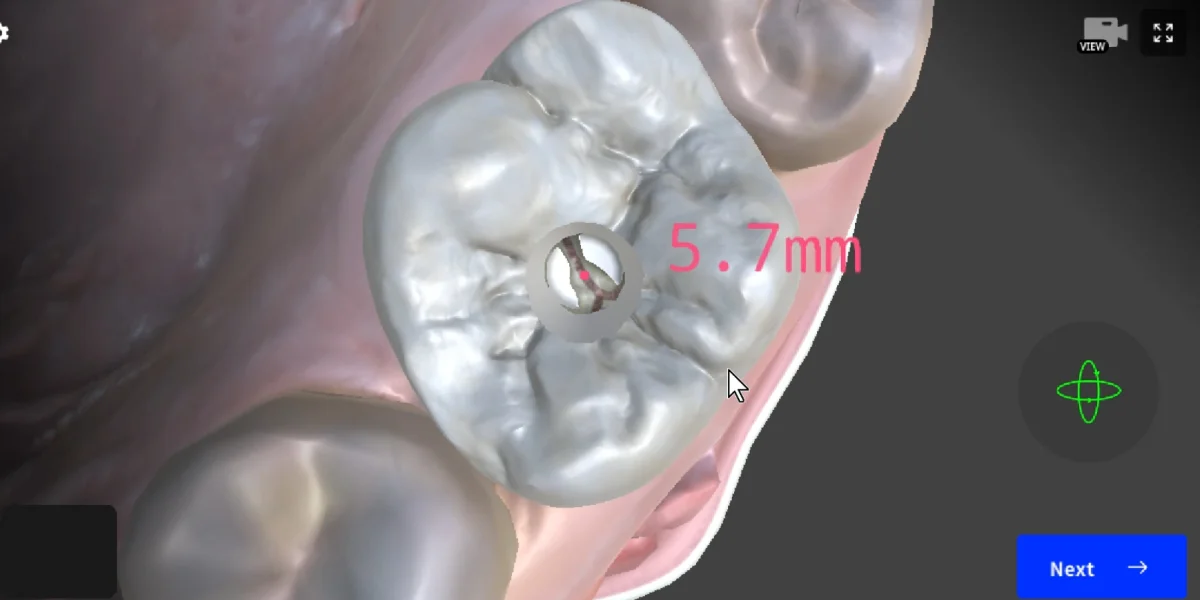 Next, you need to determine the direction of your cut. Visualize the direction of the roots in your mind, as this is crucial in clinical practice. The Dental EndoMaster app will guide you by showing the direction you've chosen. In the Secondary View, you'll see that your current path is aligned toward the center of the pulp chamber. At first, use this tool to guide your decisions, but as you practice, you'll gradually be able to choose the correct direction without assistance.