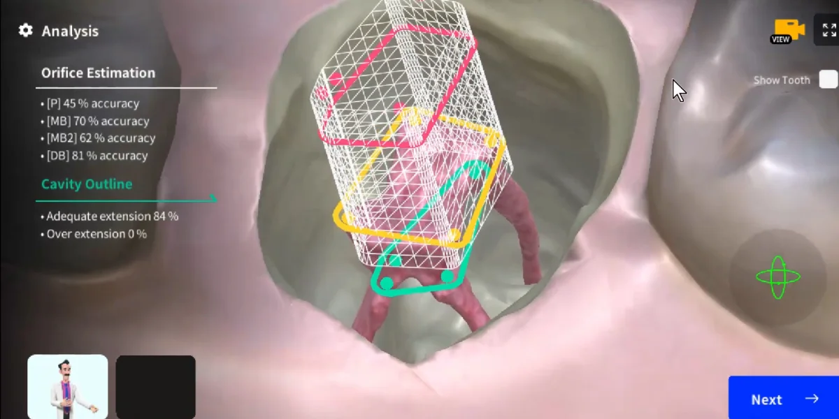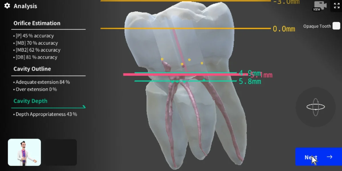 Finally, it's time to evaluate your work. The app provides a quantitative analysis of your access cavity preparation. Use this feedback to refine your understanding of canal anatomy and improve your cavity preparation technique. Keep practicing until you're satisfied with the result!