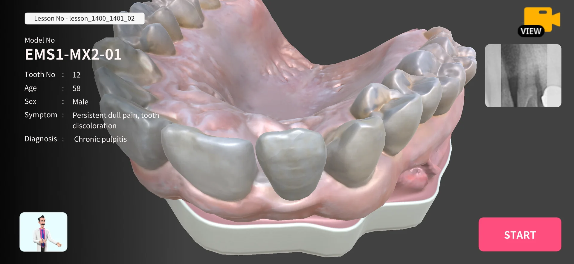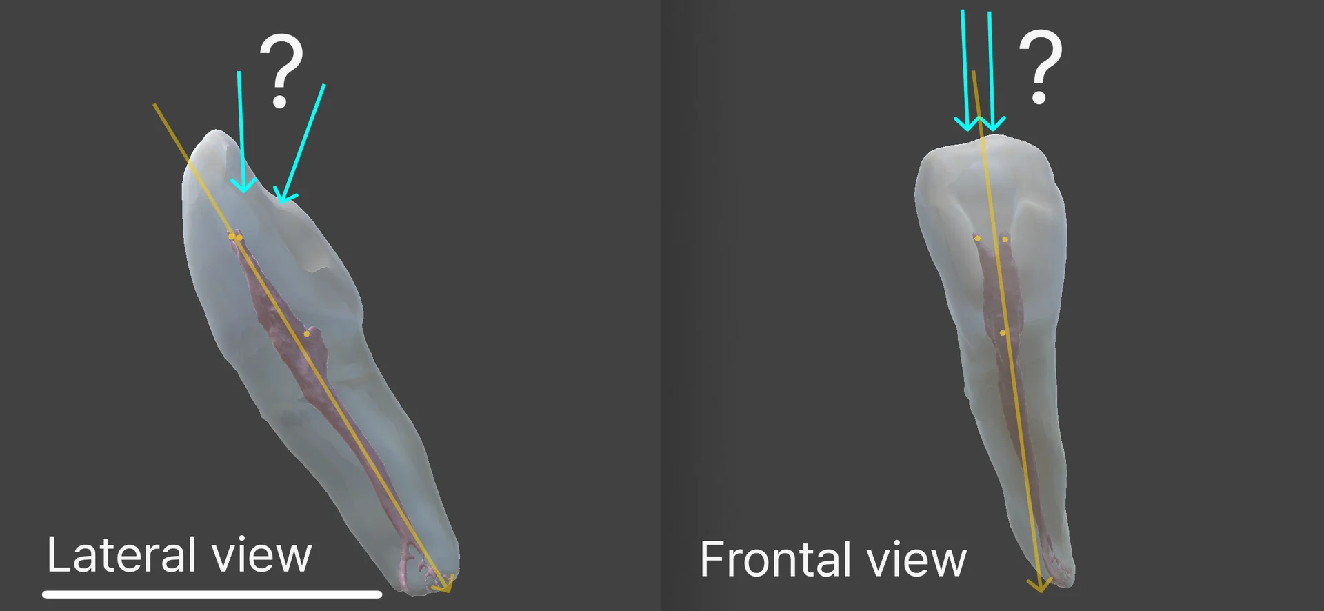 In Dental Endomaster, you first gain insights into the tooth's internal structure, including key landmarks such as the pulp horn and orifice. Understanding the internal anatomy of a tooth is essential for better endodontic treatment. Here, you can examine (1) the angulation of the tooth, (2) the location of the pulp horn and orifice, (3) the axis of the tooth(pulp), and (4) the relationship between the canal and the external shape of the tooth. This allows you to visualize information you may have learned but could not see directly.