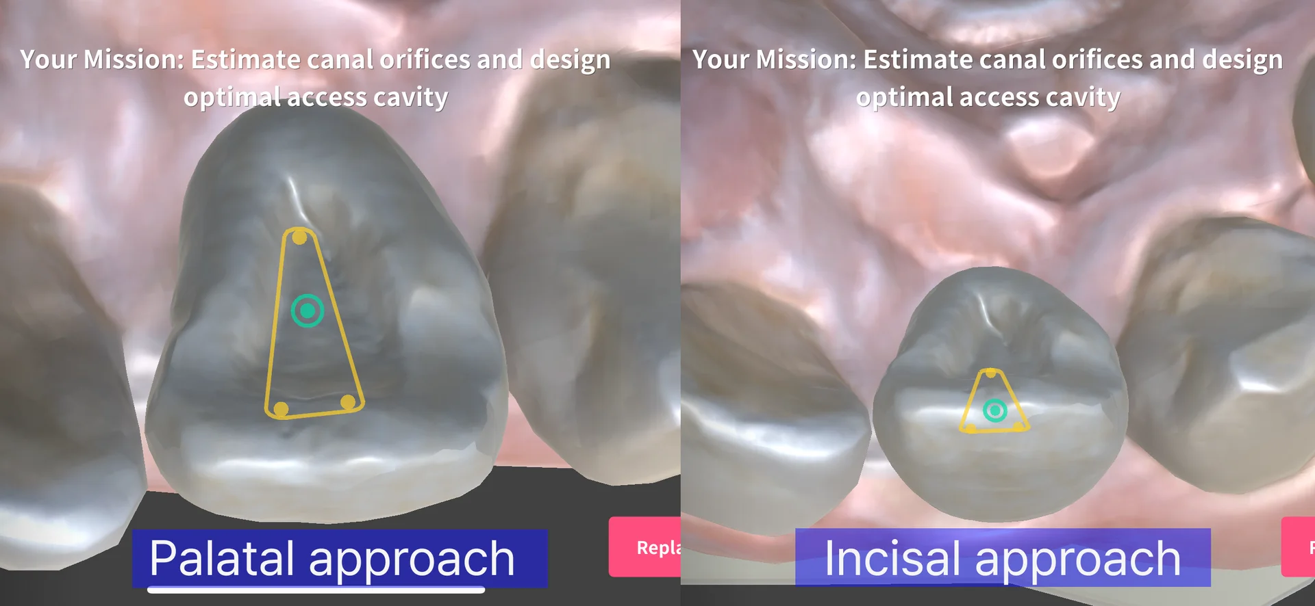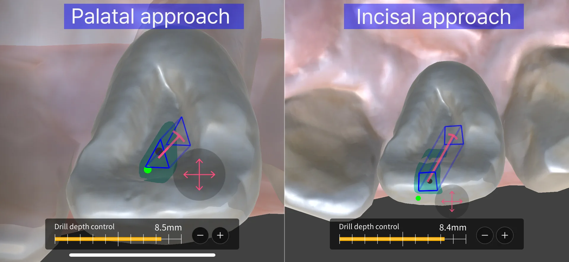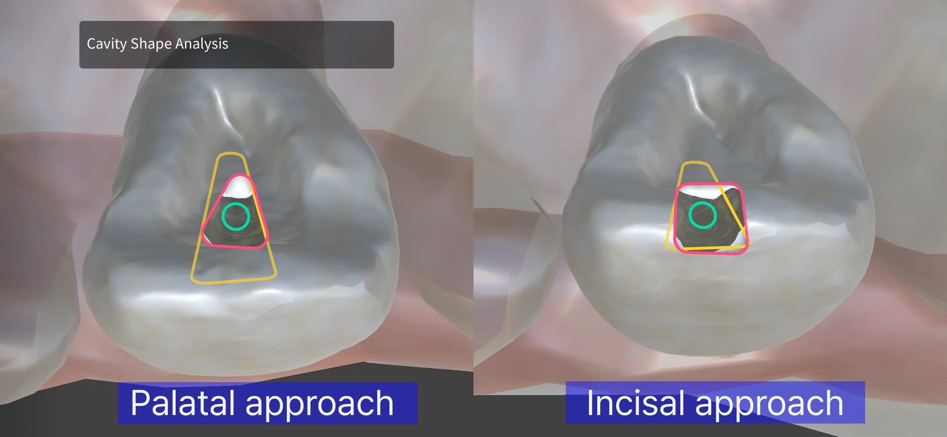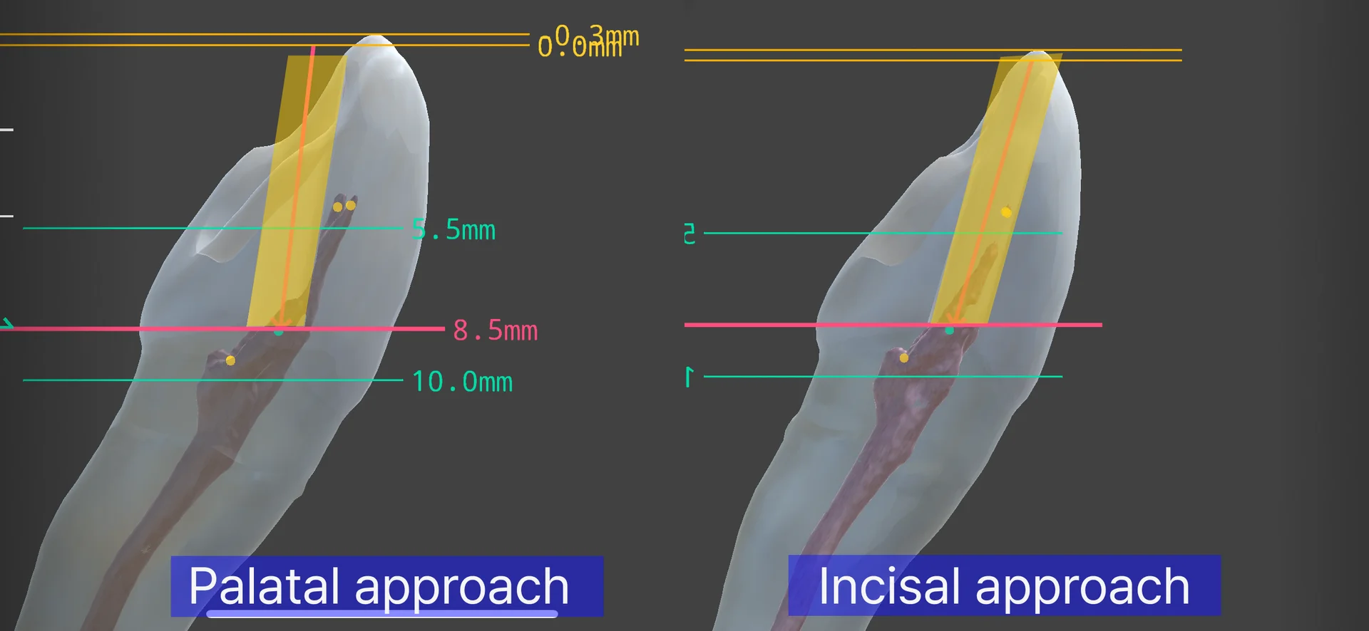 Now, let's dive into the first stage of the simulation. We’ll compare the palatal approach taught in textbooks and the incisal edge approach. Let’s first look at the palatal approach(left side of the lower image). Approaching from the midpoint between the cingulum and the incisal edge creates the following setup.