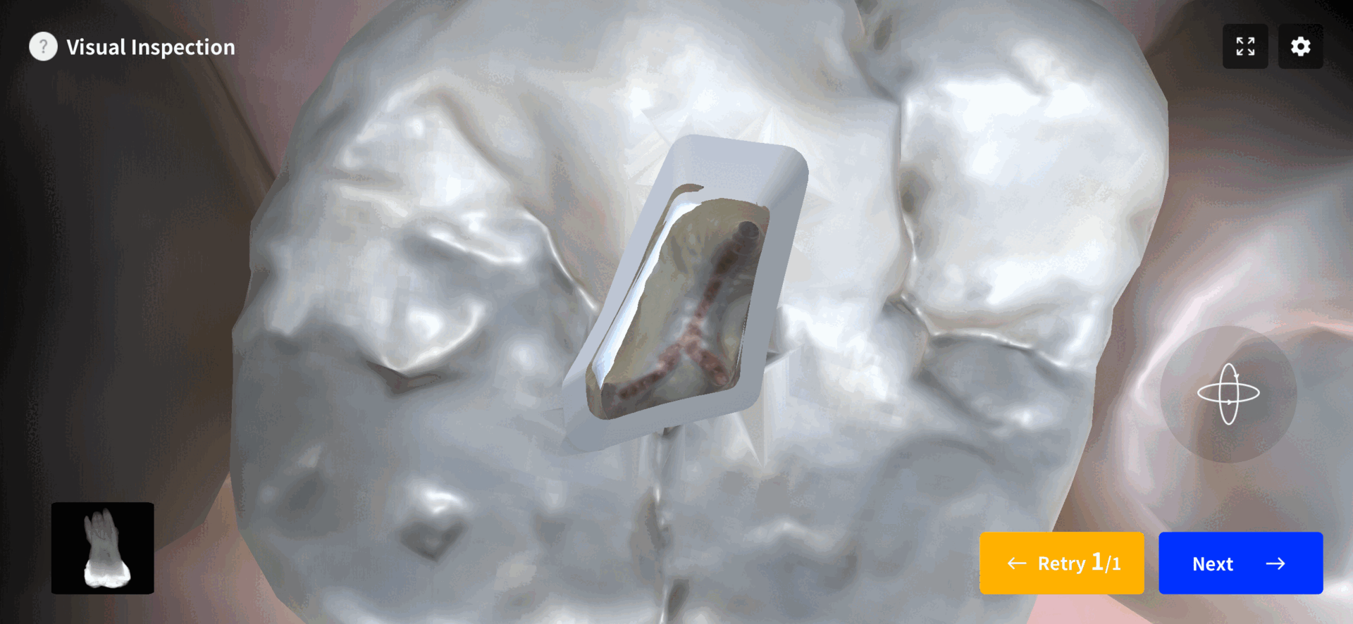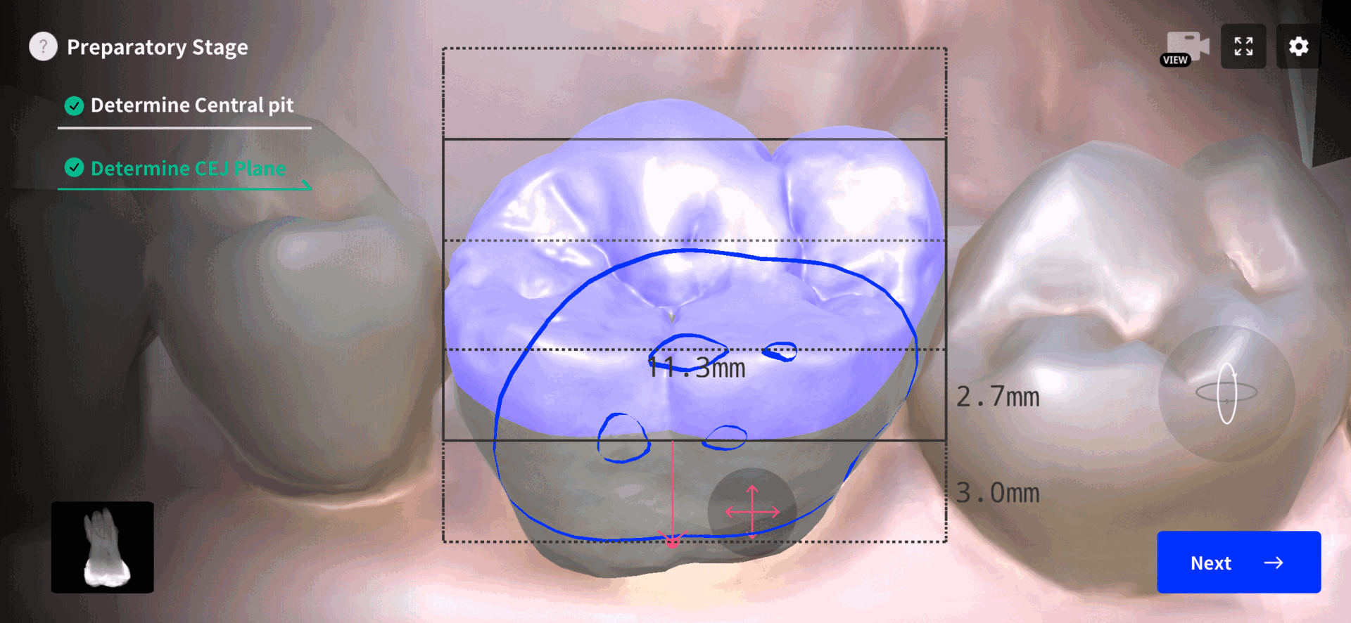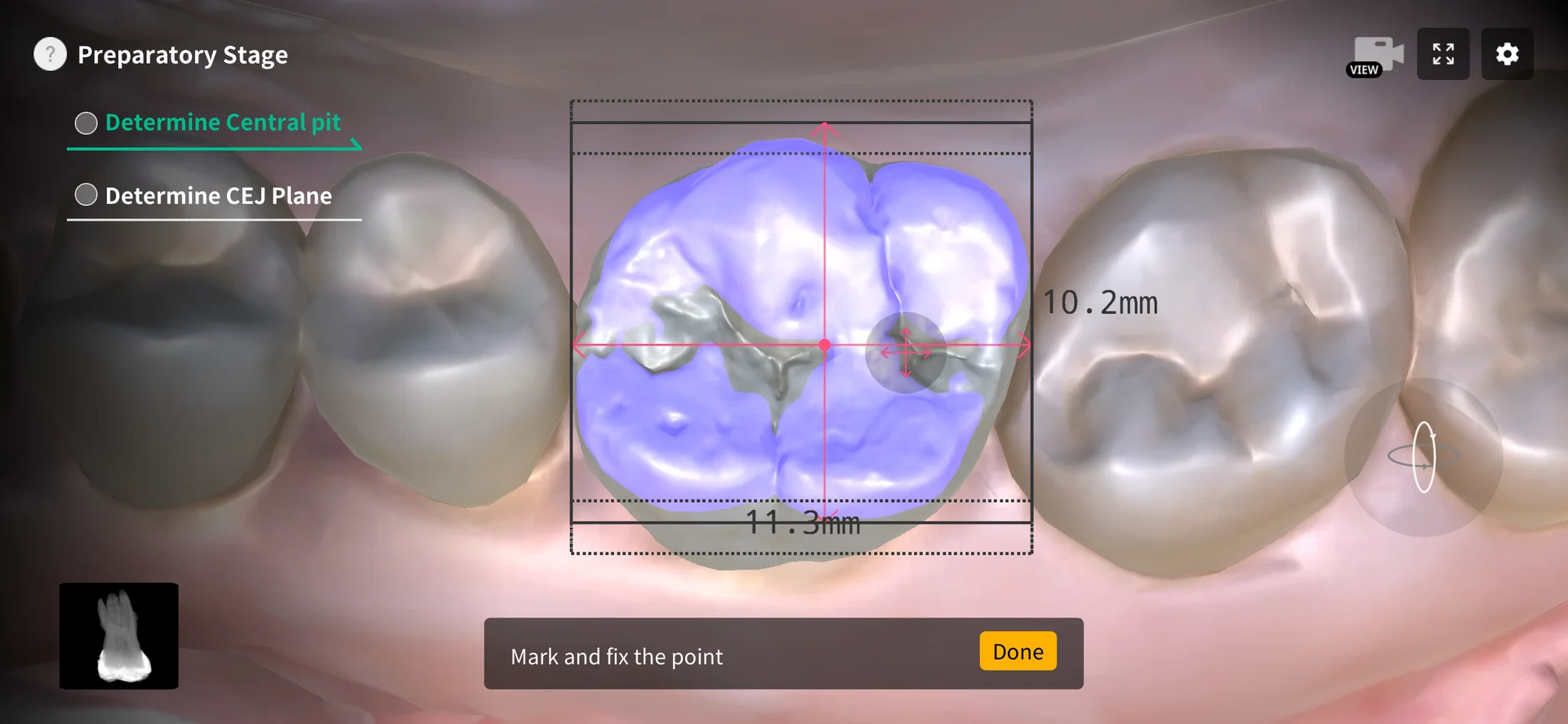 Let's set the reference for the upcoming root canal treatment. In clinical practice, this stage mirrors the removal of the occlusal surface. It is advisable to identify the central pit using the Dental EndoMaster app as a reference point for occlusal reduction. Also, take a moment to reconsider the tooth's size and height, which might have been overlooked.