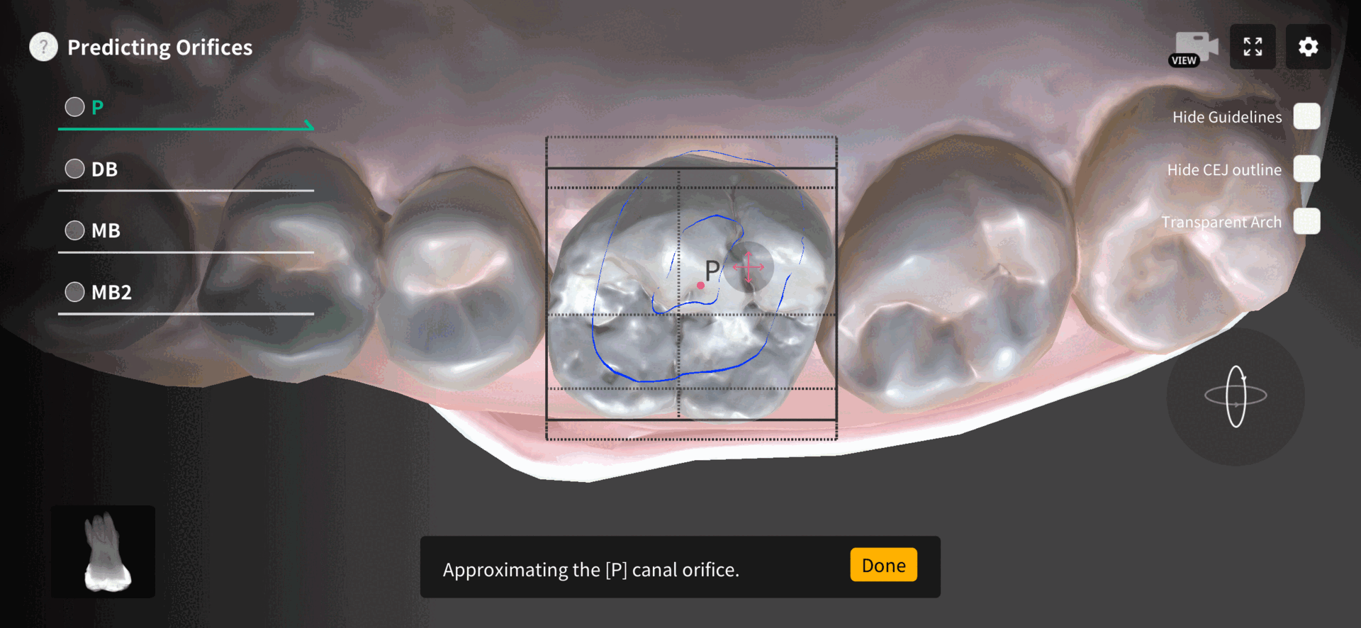 Now, it's time to earnestly seek out the canal orifices. Relying on tangible information rather than mere feeling necessitates gathering all available data. The CEJ line stands out as a prime visual indicator. As previously mentioned, you can employ the contour of the CEJ as a guide to pinpoint the locations of canal orifices. Another crucial piece of information is the direction of the roots. While the gingiva may conceal them, the shape of the crown can offer clues about the roots' trajectory. Adjusting the transparency of the gingiva in the Dental MirrorMaster app can aid in understanding root direction.