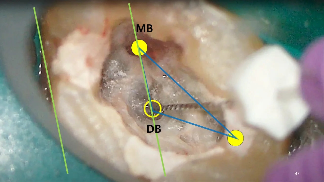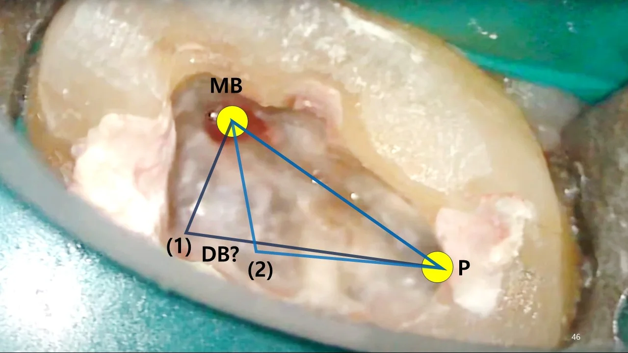 Consider a real patient case where the MB and P canal orifices were located, but finding the DB canal orifice proved difficult. Despite the severe calcification obscuring the orifice, the information discussed above can aid in estimating the canal positions.