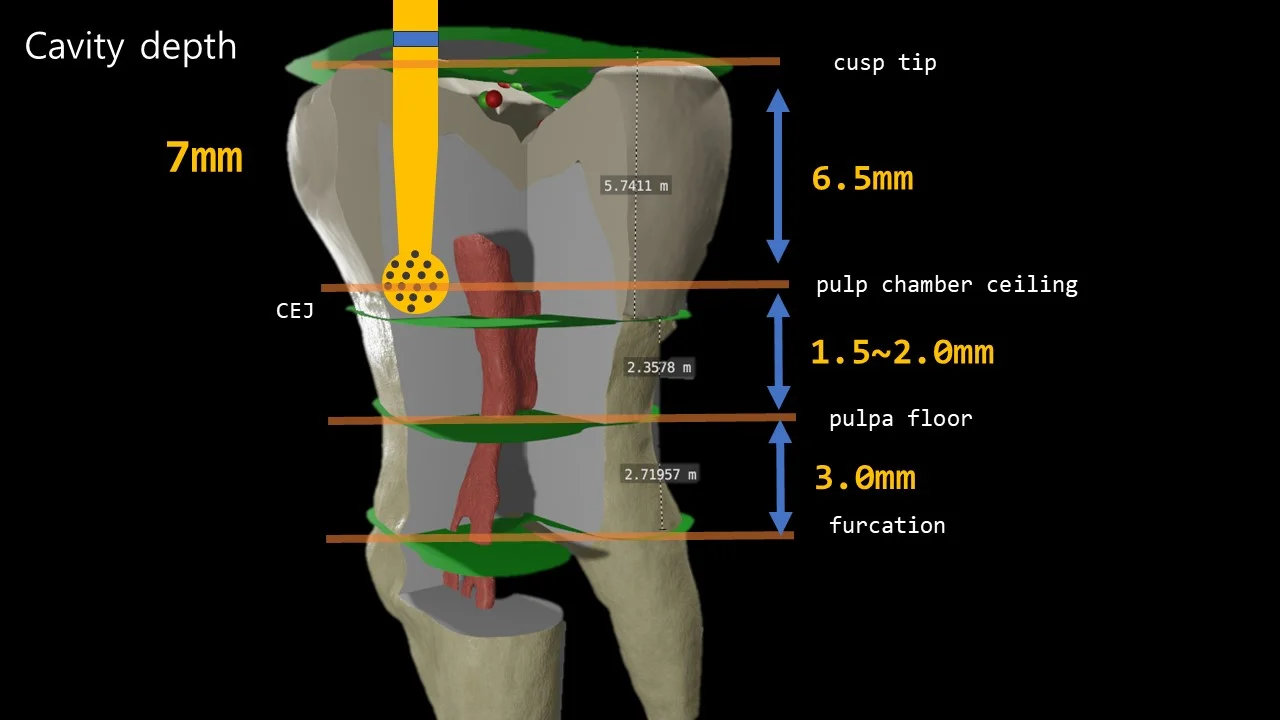 The CEJ line not only furnishes depth information but also assists in locating the canal orifices. If the orifices are obscured by calcification, navigating along the CEJ line can prove invaluable.