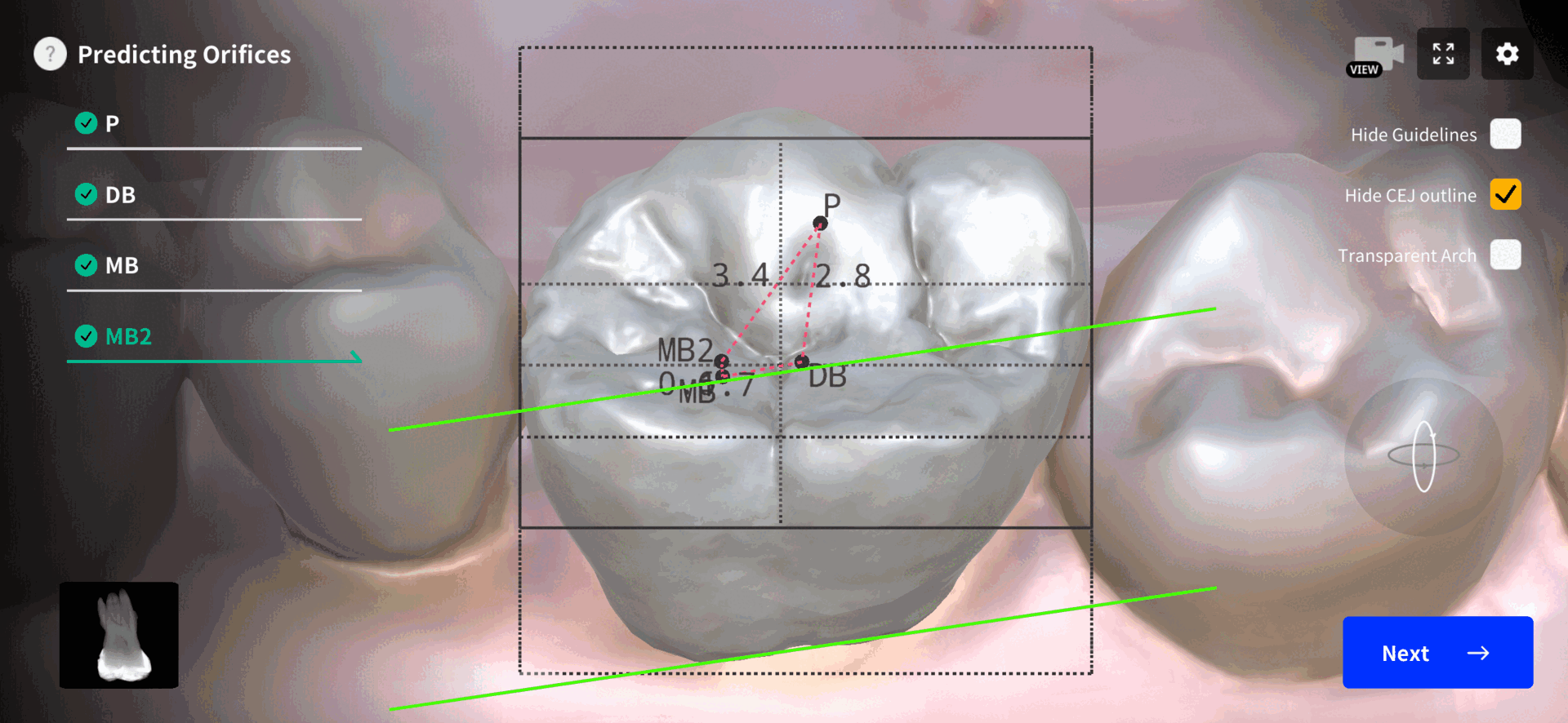 Notice how the line connecting the MB and DB canal orifices aligns parallel to the CEJ line. Regularly observing the CEJ line in the Dental EndoMaster app can help cultivate a habit of referencing the CEJ in clinical practice.
