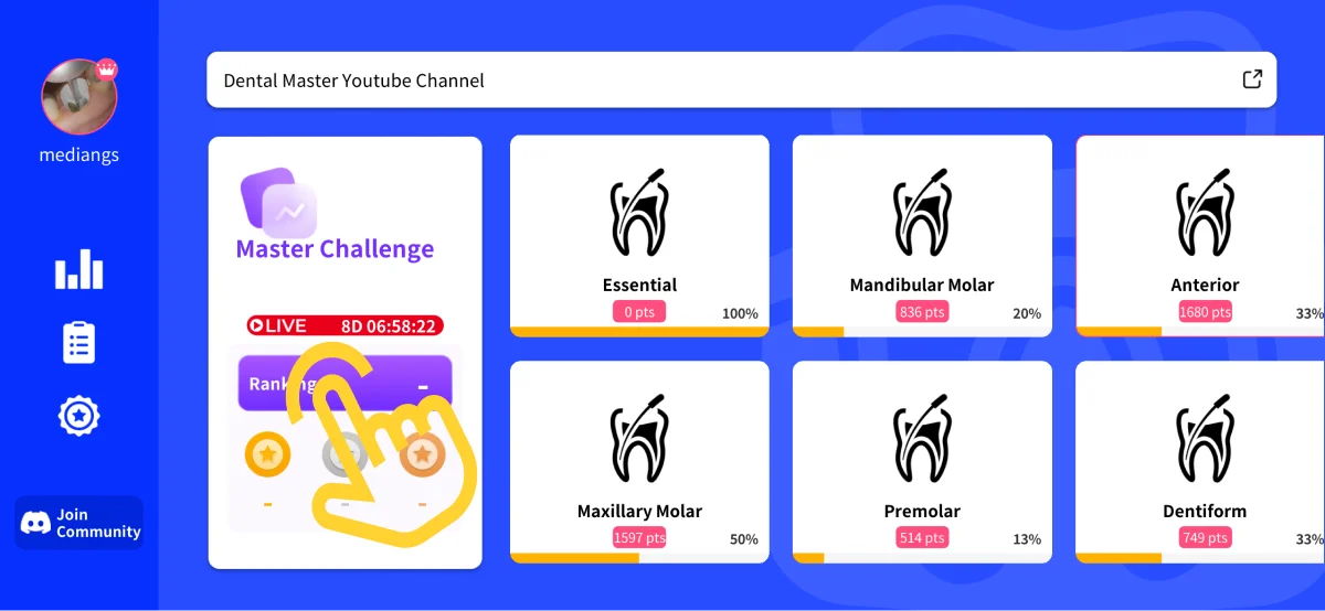 We carefully select the most educationally valuable models and upload them to the challenge mode every two weeks. Participants can observe these models, conjecture the internal structure of the canals, and simulate cavity formation. The outcomes of these simulations can be assessed from various perspectives, providing a guide for actual dental procedures.