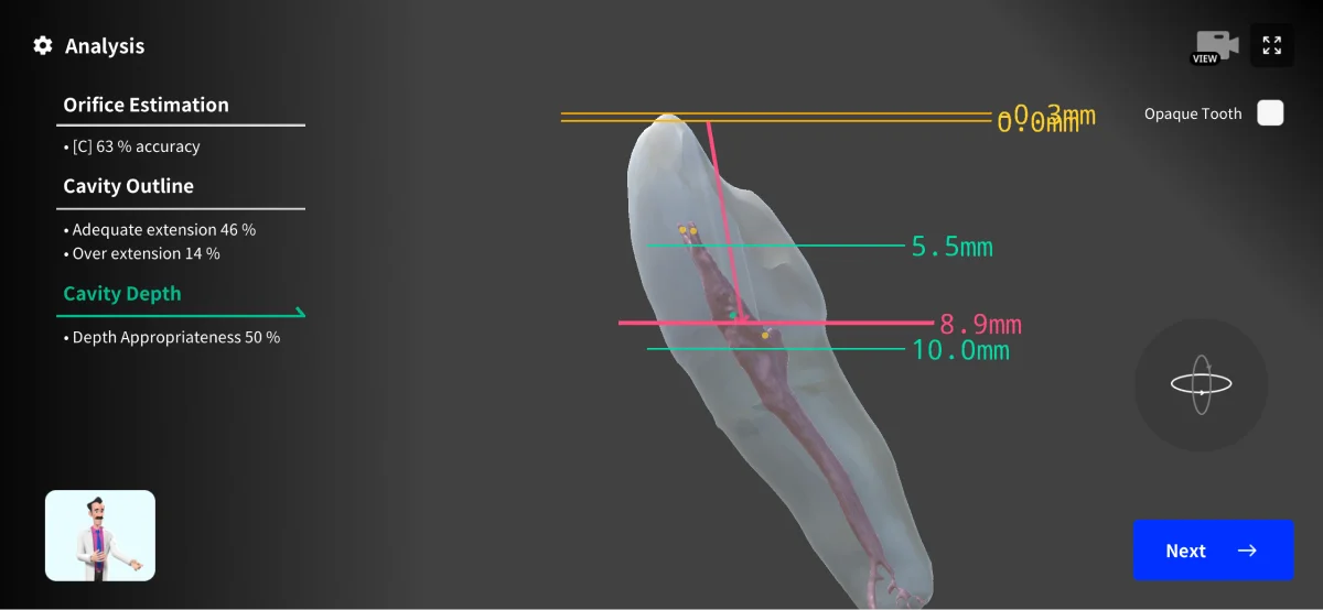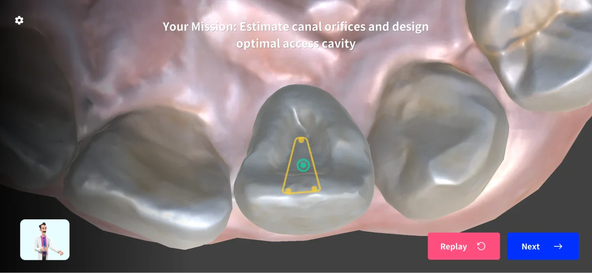 The initial screen displays an X-ray image taken before extraction alongside a modeled tooth implanted in the dental arch. As you proceed, you'll see a 3D tooth model, revealing major internal structures like the pulp horn and canal orifice projected onto the occlusal surface. Carefully observing these areas, your task is to create a cavity that includes both the pulp horn and the canal orifice.