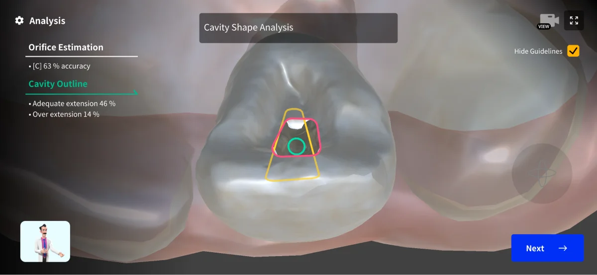 Appropriateness of cavity shape: Expanding the cavity as widely as possible without exceeding the outline formed by the pulp horn will garner higher scores.